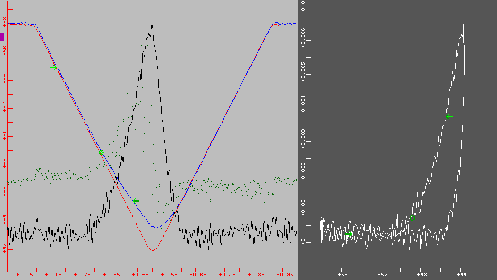 The next picture shows the experix cell poker analysis screen for a fairly typical experiment, in which the probe is moved down and then up at constant rate over a range of 16 microns in a measurement taking 1 second total. On the left, the motor motion is red, the stylus is blue, the work rate is green and the force is black. The right side shows force vs. stylus height. The green "arrow" marks indicate the time range that is selected for data fitting to determine the point of contact with the cell, and the "target" mark is the contact point determined by a 5-parameter fit to that data. This is from a study that compared cells with different types of myosin suppressed.