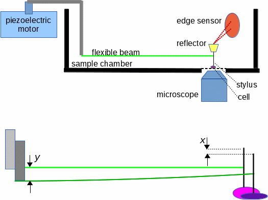 The force-sensing part is the horizontal glass beam, about 2 cm. long, which connectes the piezoelectric motor to the stylus. The stylus is made from stretched glass about 25 microns in diameter, and is sharpened to about 2 microns by dipping in hydrofluoric acid, making a tip with a gentle taper and flat end. That is brought into contact with cells adhering to a coverslip on the bottom of the sample chamber. The upper end of the stylus carries a metallized mylar reflector. The top edge of the reflector passes through the focal point of an integrated LED and photodiode sensor, giving a vertical position measurement with about 0.01 micron sensitivity and bandwidth about 3 KHz. The resonant frequency of the probe structure is about 30 Hz. The lower part of the figure represents the probe lowered to be just barely in contact with the cell, and then lowered by the additional amount y. The cell is compressed by the stylus, and the reaction force bends the glass beam, so that the stylus moves down by the amount x. That is the deformation of the cell, and the static force is G*(y - x) where G is the independently calibrated bending force constant of the beam. Actually, the experix experiment control system solves the linear harmonic oscillator differential equation to get a better approximation to the force. |