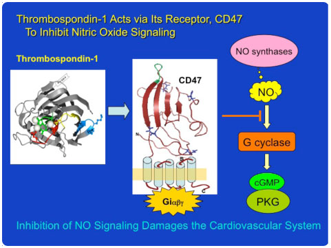 A Nobel Prize was awarded for the discovery of the physiological role of nitric oxide and NO was named the 1992 “Molecule of the Year” by Science magazine. The Frazier lab discovered that CD47 is a receptor for thrombospondin-1 and that TSP1 ligation of CD47 negates the beneficial effects of NO signaling thereby exacerbating all cardiovascular diseases. We are now studying the molecular details of the TSP1-CD47 binding interaction, the mechanism of CD47 inhibition of NO signaling and discovering new phenotypes of CD47-null mice.